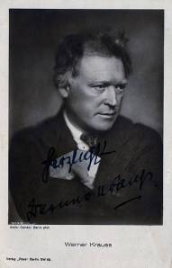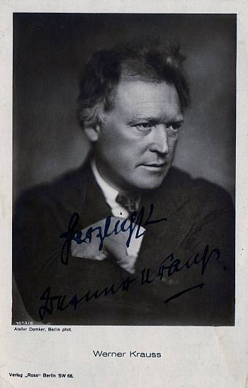Werner Krauss (1884-1959) interpretó a Caligari en este film, además de otros papeles que incluyeron a Jack el destripador en la expresionista El gabinete de las figuras de cera (Das Wachsfigurenkabinett, 1924 Paul Leni/Leo Birinsky) junto a Conrad Veidt como Iván el terrible; el carnicero de La calle sin alegría (Die Freudlose Gasse, 1925 G. W. Pabst) y a Scapinelli (el mismísimo diablo) en la segunda versión de El estudiante de Praga (Der Student von Prag, 1926 Henrik Galeen) también junto a Conrad Veidt.