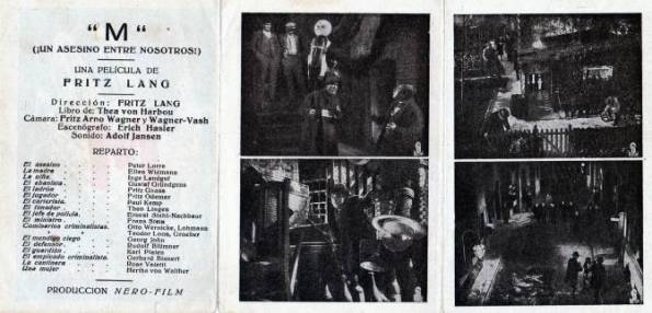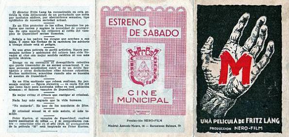 Y terminando con esta muestra de inmortales films alemanes, muestro la excepcional propaganda que se imprimió para lanzar M, el vampiro de Dusseldorf (M, Eine Stadt sucht einen Mörder, 1931 Fritz Lang), que se estrenó en el Tívoli de Barcelona el 12 de enero de 1932. Para la ocasión se diseñaron tres fantásticos modelos: Uno muy similara al anterior, en formato desplegable múltiple.