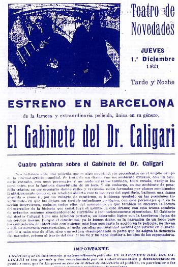 Para comenzar, aquí está el programa original del estreno barcelonés de El Gabinete del Dr. Caligari (Das Kabinett des Dr. Caligari, 1920 Robert Wiene). Un programa local del cine Novedades que, como la mayoría de los programas de esa época, no se corta en narrar el argumento completo en la parte trasera del folleto, mostrando dos escogidos fotogramas y advirtiendo a los espectadores «sensiblemente nerviosos» de la «índole dramática y desconcertante en grado sumo» del film. Este programa, del que únicamente conozco una copia, estaba en poder, hace unos veinte años, de una coleccionista de elevada edad (de la que me temo lo peor), que me dió en el Mercat de Sant Antoni una fotocopia que todavía conservo y que es la única muestra de programa de mano español de este inmortal e innovador film.