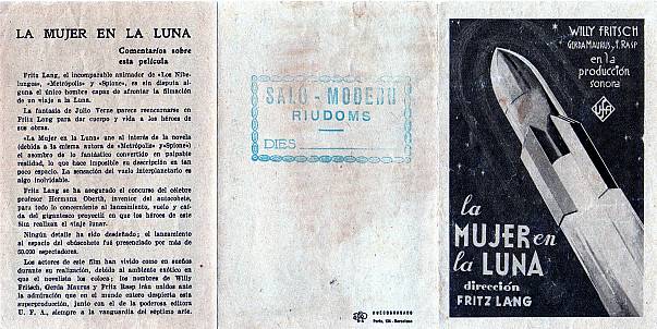Aquí vemos otro de los grandes films futuristas de Lang, La mujer en la luna (Frau im Mond, 1929 Fritz Lang) que aunque menos apreciado que el anterior, sin duda tiene mucho elementos interesantes. El programa que se editó fue en formato desplegable múltiple, con fotogramas, frases de publicidad, críticas y , otra vez, el argumento completo.