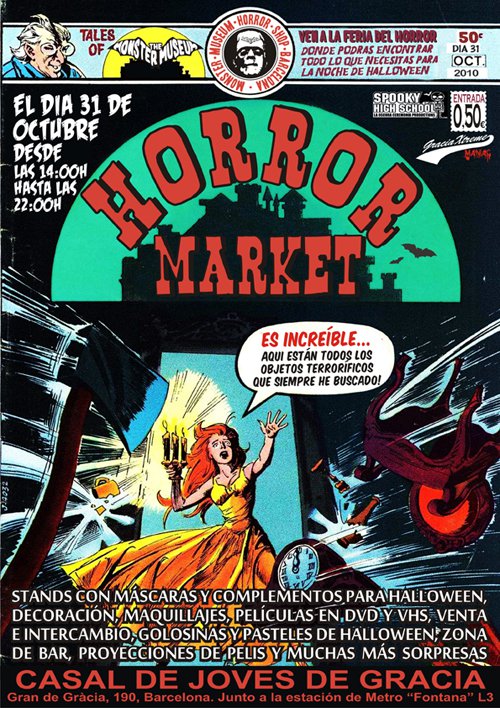 Éxito de expositores y de asistencia de público en el Horror Market que organizó Monster Museum el 31 de octubre en pleno barrio de Gracia. Fue una gozada pasear y trastear entre distintos artilugios sangrantes, pastelitos, VHS’s, DVD’s, máscaras y gominolas, además de contar con la presencia de fanzinerosos y cortometrajistas varios.