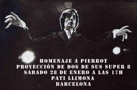 Este fin de semana y dentro de la Mostra de cine en Super-8, podremos ver el sábado 28 a las 17 horas, dos de los cortos que el recientemente fallecido Pierrot rodó durante los años 70. Dos valientes muestras (en unos tiempos en el que las cosas no estaban para experimentos transgresores) de cine de temática gay, mezclado con el fantástico, gran pasión del artista. En su momento ya os informamos de esta propuesta, pero ahora ya se saben los títulos que se proyectarán, una hora de puro delirio en una ocasión única como homenaje a Pierrot: