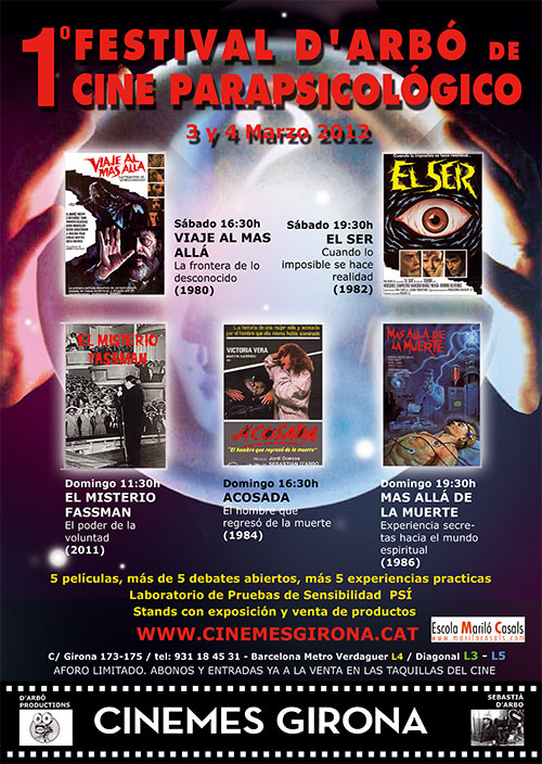 El fín de semana 3 y 4 de marzo tendrá lugar la primera edición del Festival de Cine Fantástico Parapsicológico en los Cine Girona de Barcelona, un festival para los amantes del cine de terror que se dedicará este año a los fenómenos paranormales. Será la primera ocasión en la que se podrá disfrutar en una sala comercial de la trilogía de películas parapsicológicas realizadas por Sebastián D’Arbó, además de dos más del mismo director, una de ellas el documental El misterio Fassman, que se presentó en la pasada edición del Festival de Sitges.