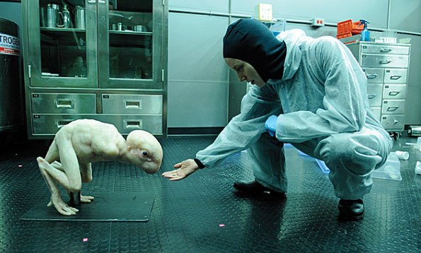 Aunque allí el monstruito que crece es alienígena, los piesecicos son idénticos a los de la nínfulamonstruo, mezclado con algo de Estoy Vivo, e incluso con la alargada sombra de Aliens cuando la criatura nace, más otras referencias más evidentes como sería el caso de Species. Todo un cóctel de géneros: monsters movies, como ya he dicho, sci-fi, terror (y gótico además), melodrama familiar, algunos dicen que thriller, e indie, pues hay voluntad de autoría. Y los cócteles es lo que tienen, si no los agitas bien, en vez de un combinado lo que obtienes es una emulsión en fase dispersa (como cuando se mezcla agua y aceite y se deja en reposo). A Natali le falla el pulso y se va perdiendo el tono a lo largo del film para acabar precipitándose hacia un final operístico (o de opereta, si lo prefieren). Ahora bien, hay que calibrar esas críticas, porque, con todos sus fallos (incluida la napia del Brody) entretiene, pero sobre todo porque sus virtudes superan a sus defectos: los efectos especiales son dignos merecedores del premio con el que se alzaron en la edición de Sitges de 2009; la construcción sintáctica de los planos y secuencias es mucho más que correcta, Natali mueve la cámara de forma interesante, con exceso de barroquismo en ocasiones pero con muy buen tino en otras muchas (el arranque donde rueda el parto en cámara subjetiva, el uso narrativo de la angulación, los fundidos a blanco y a negro aunque sean más tópicos); y, quizás, la iluminación sea uno de sus mayores logros, ese azul metalizado que vira los colores crea atmósfera y es la atmósfera la que evita la total fractura del film, es en la atmósfera donde se da la continuidad porque es la que va acompañando la trama profunda. Bajo la superficie de la acción se va desarrollando un hilo interno que es el que no se quiebra pese a las mezclas que comentábamos, no ya por lo que se refiere a las subtramas, sino, sobre todo, al tema de reflexión para el que el argumento es excusa: la pregunta por cuáles son, o debieran ser, los límites de la ciencia. Veamos más despacio todas estas virtudes enumeradas.