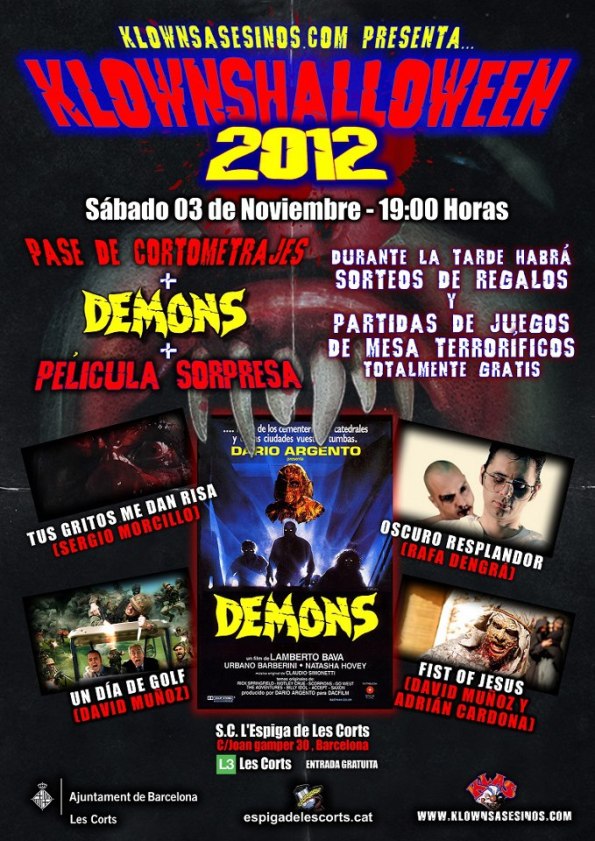 Una sesión donde disfrutaremos de cuatro cortometrajes, tres de ellos recientemente estrenados en el festival de Sitges 2012, y la proyección de dos largometrajes, The Last Will and Testament of Rosalind Leigh (Rodrigo Gudiño) que compitió en dicha edición, y Demons el gran clásico de Lamberto Bava. También contaremos con el habitual stand de camisetas, quiz games y regalos entre sesiones, y para terminar la noche, por primera vez en un KlownsHalloween, organizaremos un torneo de juegos de mesa zombie.