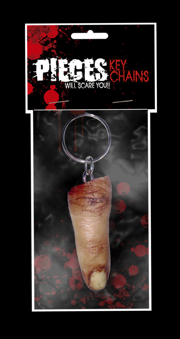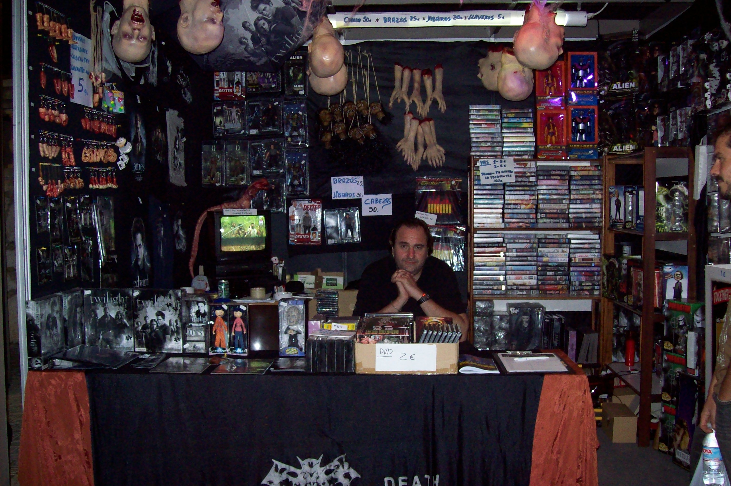 En VHS original “El Mas Allá” de Lucio Fulci; de derechos adquiridos “Street Trash”; de cosecha propia “Gorex, The Zombie Horror Picture Show”. En camisetas “El Vengador Toxico”. Y mi producto estrella de los últimos años: “El Llavero Dedo”.