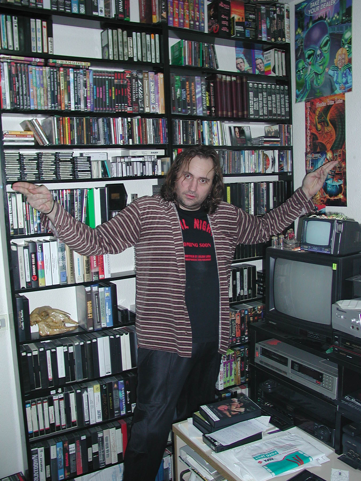 fondos” de JF (Jose Frade PC), navegando por aquellas estanterías y recogiendo todas las VHS que se me ponían delante, hasta que no entraban mas en el coche. «Miedo en la Ciudad de los Muertos Vivientes”, “El Más Allá”, “Aquella Casa al Lado del Cementerio”, “Comidos Vivos”, “Canibal Ferox”, etc, etc, etc….. Pósters a mansalva, foto-cromos, y un largo etcétera de material que entonces hacían las delicias de los seguidores. Recuerdo reeditar para España títulos como “Street Trash”, producir y editar ese “Gorex, The Zombie Horror Picture Show” o “Viernes 13 XXL, Jason se lo Monta de Miedo”, magníficos pornetes en versiones “soft” de Ángel Mora, y por otro lado hacer maravillosas copias de cintas americanas currándome el “dubbing” con el audio de alguna emisión televisiva nacional. Tengo grandes recuerdo “vintage”, pero no, no lo echo de menos. Hace apenas dos años me deshice de prácticamente toda mi colección VHS y Betamax (unas 4000 cintas), que evidentemente tengo en DVD o pasadas a disco duro…. Y no, ¡no estoy loco!, conservo todas las carátulas originales.