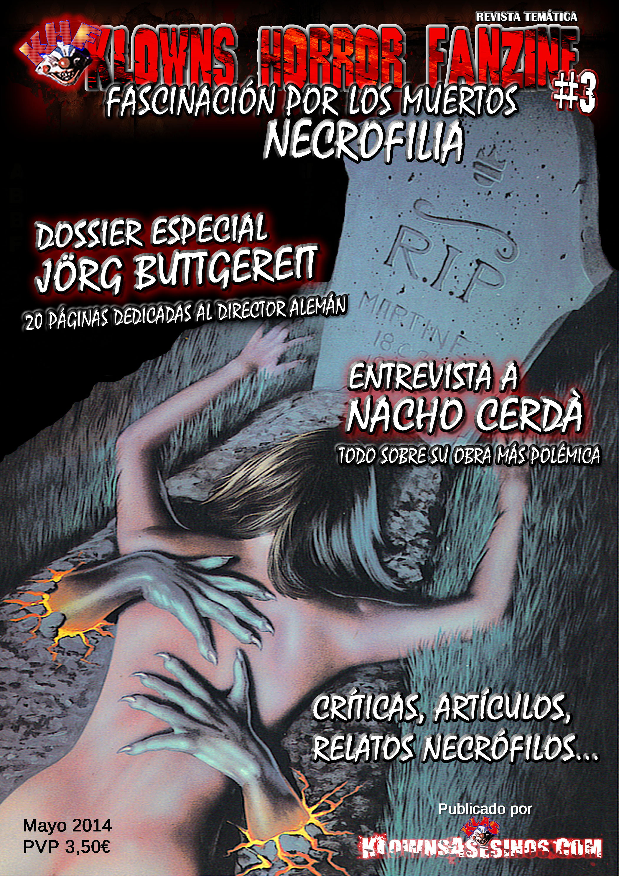 Ya está a la venta el tercer número de Klowns Horror Fanzine, una publicación que nació como programa-complemento de los pases que los responsables de la página web dedicada al cine fantástico y de terror Klowns Asesinos realiza periódicamente en el Centro Cívico L’Espiga de Les Corts y que ha ido creciendo en páginas y colaboraciones hasta convertirse en todo un fanzine. Al igual que las sesiones programadas, la publicación es temática, dedicándose su primer número a los muñecos asesinos, el segundo al giallo y el tercero al escabroso tema de la necrofilia y la fascinación por los difuntos.