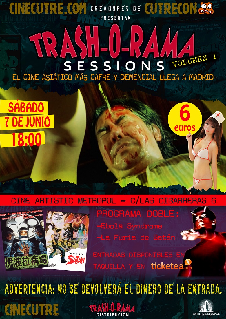 La web de cine y humor Cinecutre.com, responsable del festival Cutre Con, se ha aliado con la distribuidora Trash-O-Rama, especializada en cine basura, para proyectar en Madrid las películas asiáticas más cafres y demenciales en las Trash-O-Rama Sessions, cuya primera entrega tendrá lugar el 7 de junio en la sala de cine Artistic Metropol (C/ De las Cigarreras, 6).