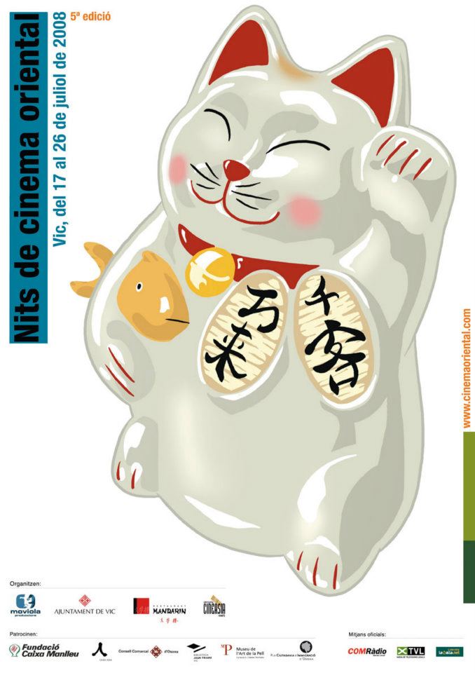 El festival tiene mascota desde el 2008. No sé si llamarle mascota, la Asociación tiene al Maneki neko como su emblema, luego, dependiendo del país protagonista de cada año, se escoge una imagen u otra, un animal o ser representativo de la cultura y folklore del país. La mano sensible y sabia de Xevi Domínguez, autor de los personajes que pueblan los carteles anuales de las “Nits”, ha dibujado ese Maneki neko, luego un cerdo vietnamita, un demonio tailandés, el rey mono chino Sun Wukong, el dragón cantonés Siu Lung, el oso negro de Formosa Xi Wang, y el tarsio Gwapo, de Filipinas. Xevi ha trazado una línea de dibujo que respeta año tras año y se enriquece con el diseño posterior de Christian Inaraja y Sílvia Ferrán.