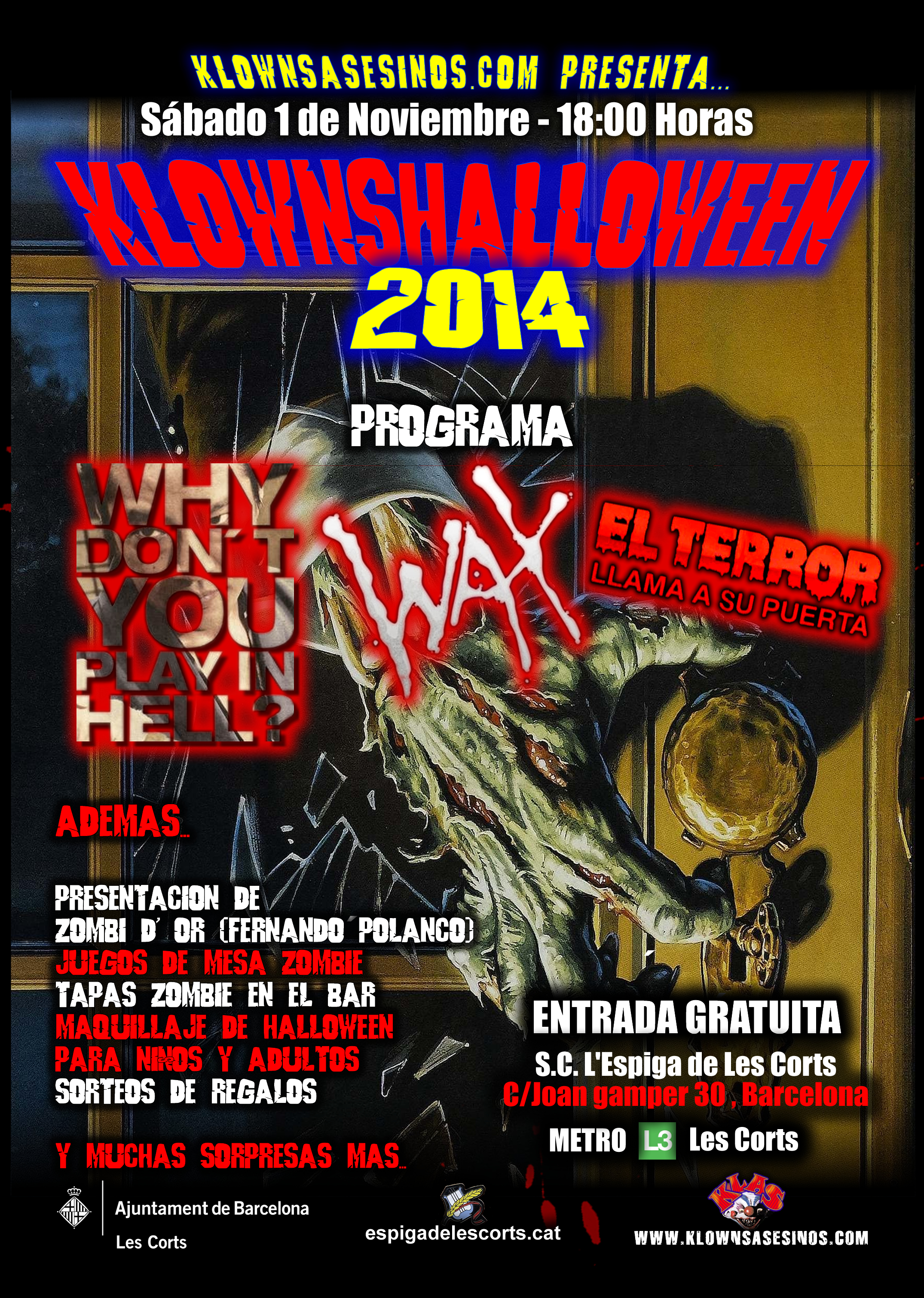 Un año más, la web de cine Fantástico y de Terror KlownsAsesinos.com, con la colaboración de La Societat Coral L’Espiga de Les Corts y del Ayuntamiento de Barcelona, organiza el KlownsHalloween 2014, una intensa sesión de proyecciones, con sorpresas y diferentes propuestas para celebrar la mítica noche de Halloween. Todo en un ambiente divertido y terrorífico.