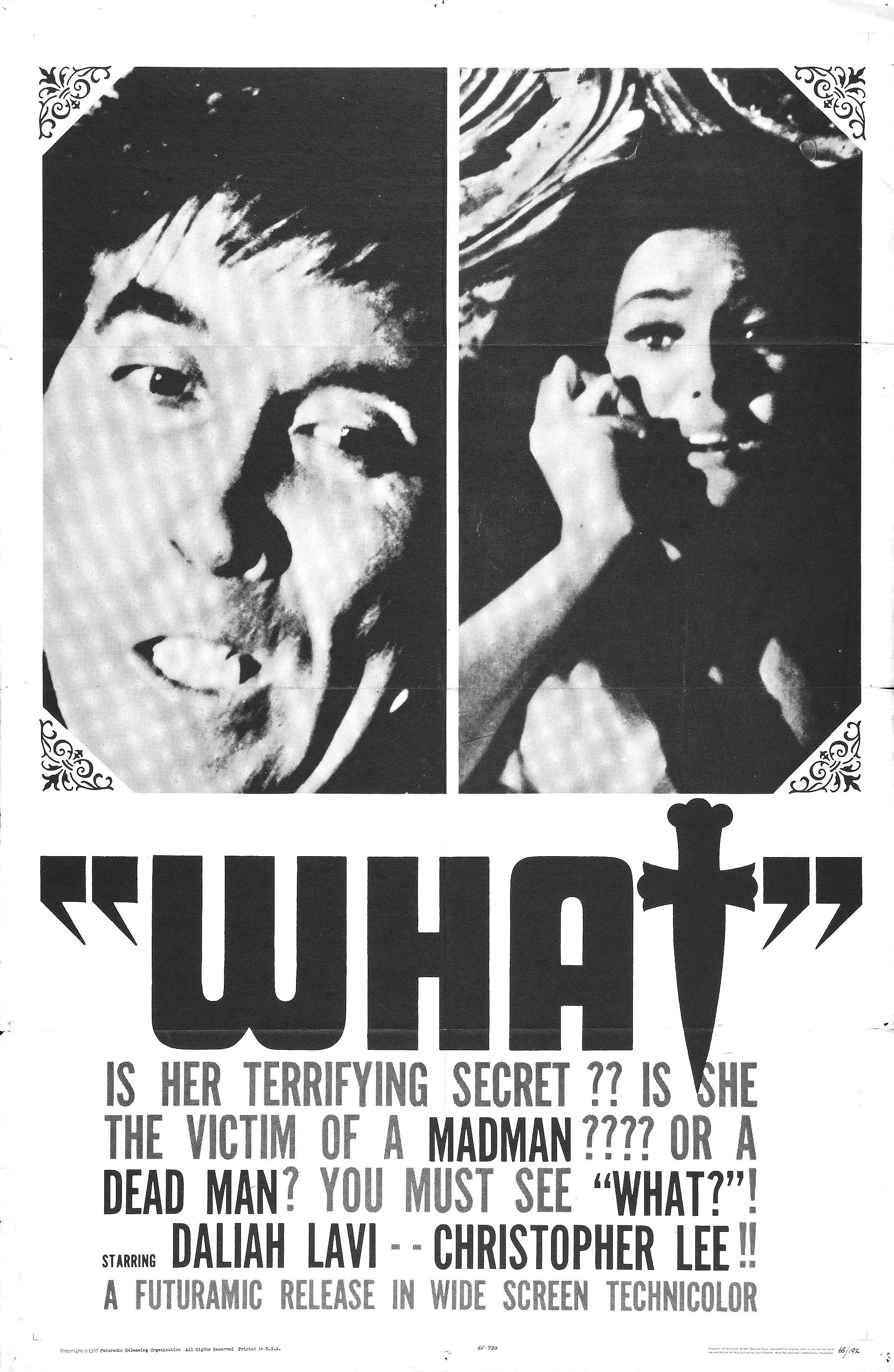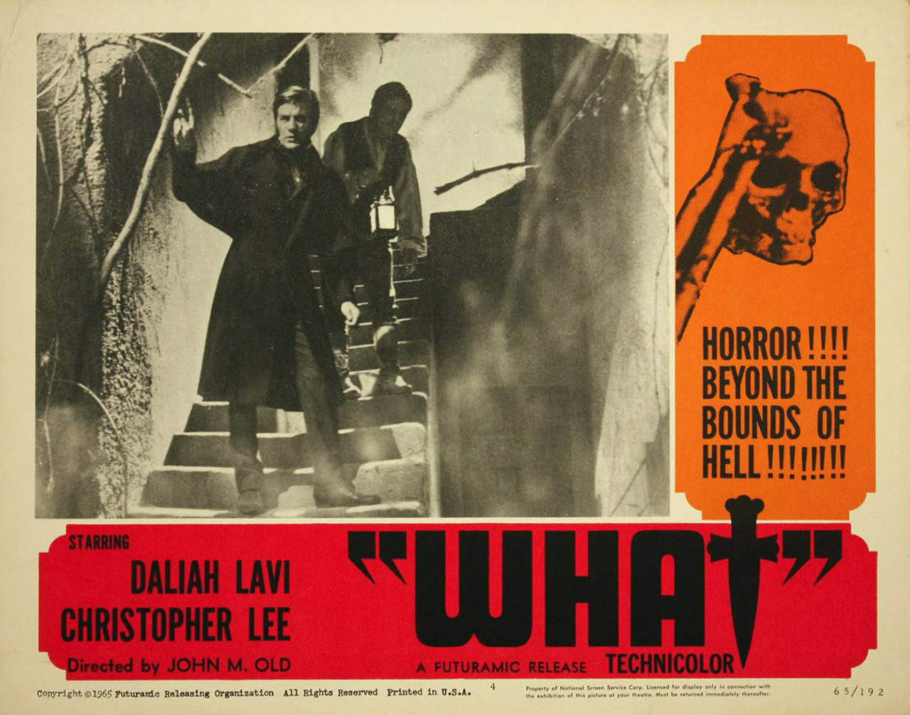 Hemos querido incluir una selección de carteles originales de La fruta e il corpo, colección en la que podemos ver que el italiano ha sido el que ha inspirado a prácticamente todo el resto. La belleza de la cartelería italiana, así como los magníficos fotomontajes que realizaban para las fotobustas, siguen siendo piezas magníficas. El motivo de estos posters casi siempre se centra en Daliah Lavi, ya sea mostrando su rostro o de forma más sexual, su cuerpo. Y naturalmente en la estrella, Christopher Lee, con el látigo en ristre. El título casi siempre se ha respetado, aunque destaca por lo contrario uno de los títulos con los que la película se exhibió en Estados Unidos, What, así como el que se puso en Inglaterra, Night is the Phantom, que prescindió del látigo en su cartel y en su título. Y eso que el Reino Unido es la cuna de la denominada disciplina inglesa. Finalmente destacar el póster alemán, cuyo título se traduciría como El demonio y la virgen.