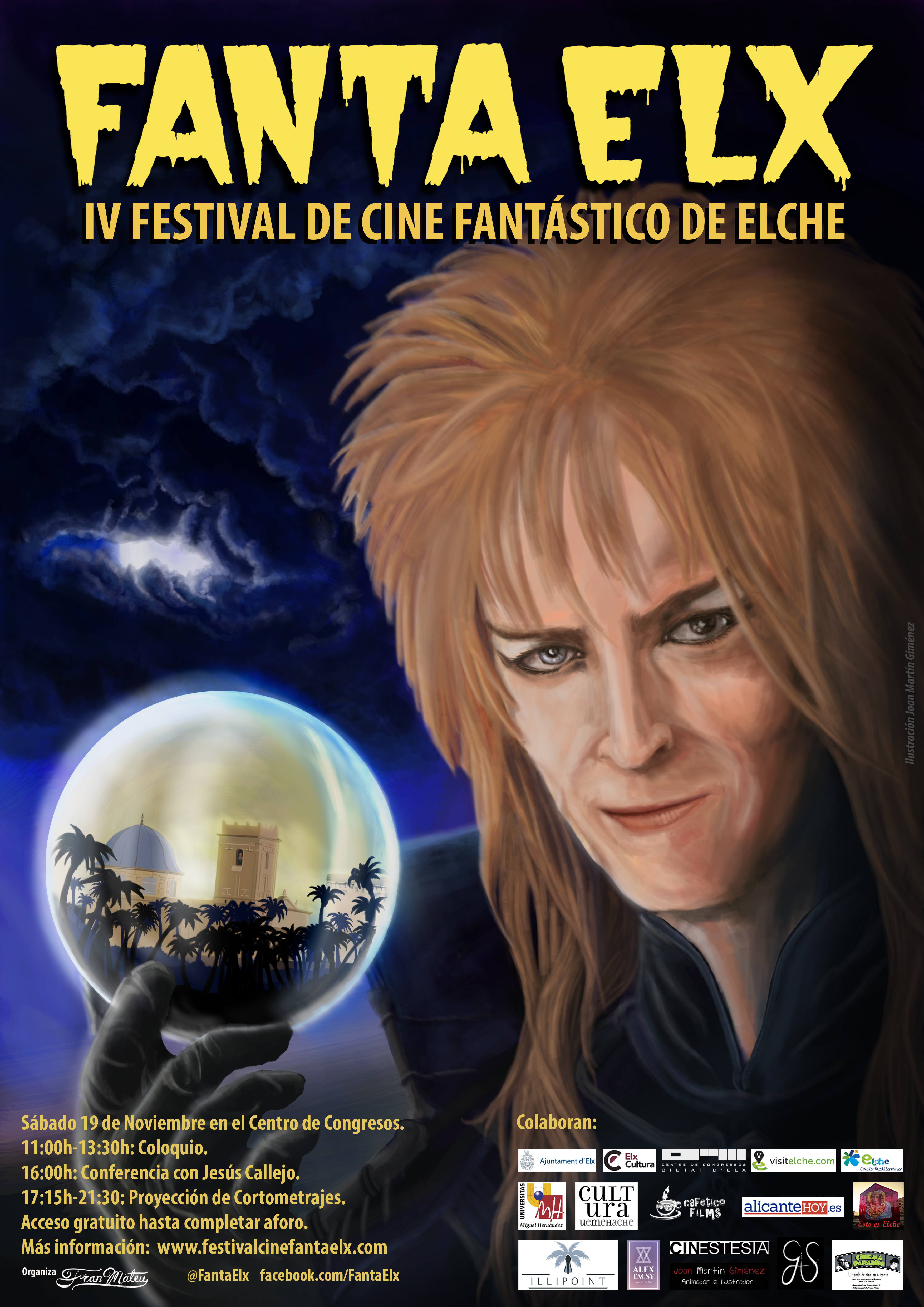 El Festival de Cine Fantástico de Elche – FANTA ELX, que se celebrará el sábado 19 de noviembre en el Centro de Congresos, ha compartido el cartel de su cuarta edición. El ilustrador Joan Martín Giménez (autor de trabajos de animación como el multipremiado cortometraje «Candyhearts«) se ha encargado de diseñar la imagen del festival basándose en la película Dentro del Laberinto (1986), dirigida por Jim Henson, que este año se cumple el 30º aniversario de su estreno. En la ilustración aparece el personaje de Jareth (rey de los Goblins en el largometraje) encarnado por el recientemente