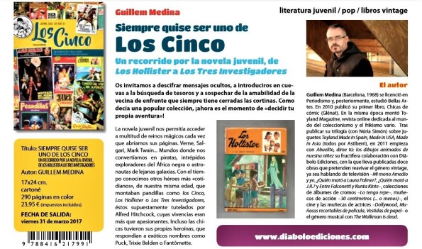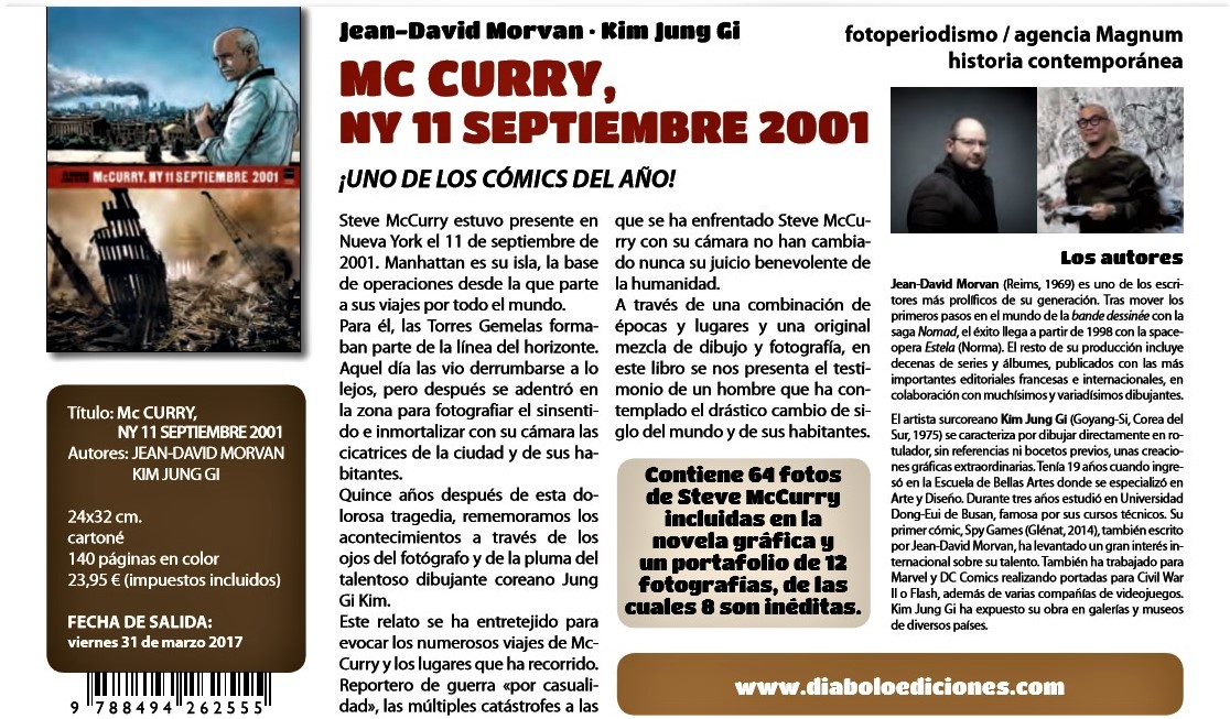 En un mes tan especial como es este para una editorial de comics, Diábolo edita una novela gráfica sobre un suceso siempre de actualidad, y lo hace con una mezcla de fotografía y cómic que sin duda hacen e este McCurry, NY 11 septiembre 2001 una obra a destacar de entre las de este año. La revista Cthulhu cumple diez años. 17 números ofreciendo cómics de terror. Y en su exitosa linea de libros dedicados a la cultura popular, Diábolo nos ofrece una monografía sobre la canción infantil a cargo de Jorge Lérida, y Siempre quise ser uno de los cinco, obra en la que Guillem Medina se adentra en la literatura juvenil.