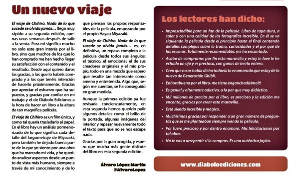 El extraordinario y merecido éxito de ‘El viaje de Chihiro. Nada de lo que sucede se olvida jamás…’ de Álvaro López Martín ha sido tal que en dos semanas se ha agotado, obligando a la editorial a lanzar este mes una segunda edición. Pero Diábolo sigue apostando por el Anime y el Manga en sus dos novedades enmarcadas en su colección de Cultura Popular. Por un lado un enciclopédico volumen dedicado a Sailor Moon en todas sus manifestaciones, ‘En nombre de Luna, te castigaré. El universo mágico de Sailor Moon’; y para los más nostálgicos un repaso a los dibujos animados de BRB Internacional: ‘Gnomos, Naranjitos y Mosqueperros’.