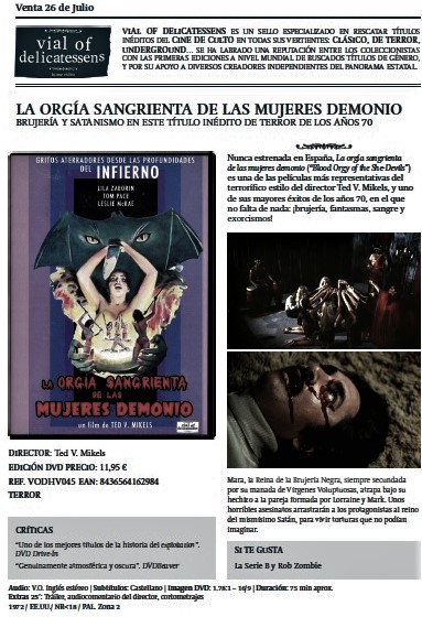 Vial of Delicatessens se ha aliado con el hacedor de cine trash de terror Ted V. Mikels, de quien va a sacar al mercado español varias películas inéditas, ya no solo en formato DVD, sino también en VHS. Muy pronto Corpse Grinders y Astro-zombies invadirán nuestras pantallas, pero de momento demos paso a las mujeres demonio y los come-gusanos…