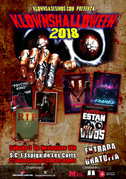 ¡Este año estamos de celebración! La web de cine Fantástico y de Terror KlownsAsesinos.com, con la colaboración de laSocietat Coral L’Espiga de Les Corts y del Ayuntamiento de Barcelona, organiza en la ciudad Condal el Klowns Halloween 2018, décima edición de éstas terroríficas y divertidas maratones. Un año más, tenemos preparada una variada programación con 3 largometrajes, 3 cortos de primer nivel, divertidos sorteos y quizgames y muchas sorpresas más. La maratón servirá también para celebrar el 30 aniversario del estreno de la cinta de culto Están Vivos de John Carpenter. ¡¡No puedes perdértelo!!