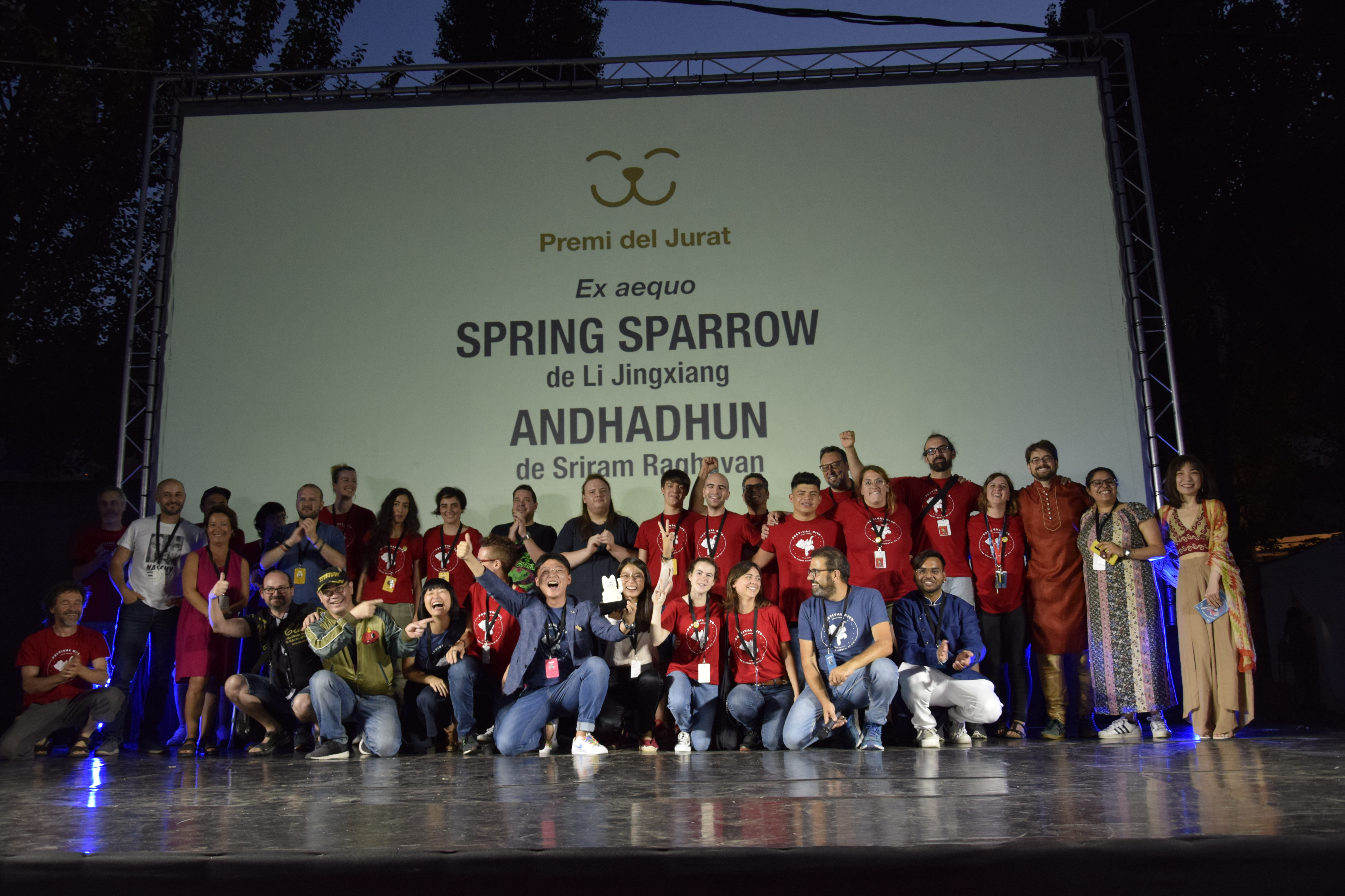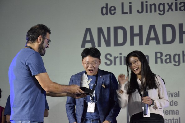 La directora y uno de los actores de Spring Sparrow, recogiendo el premio del jurado a la mejor película, que recibieron ex aequo con Andhadhun (India, 2018)