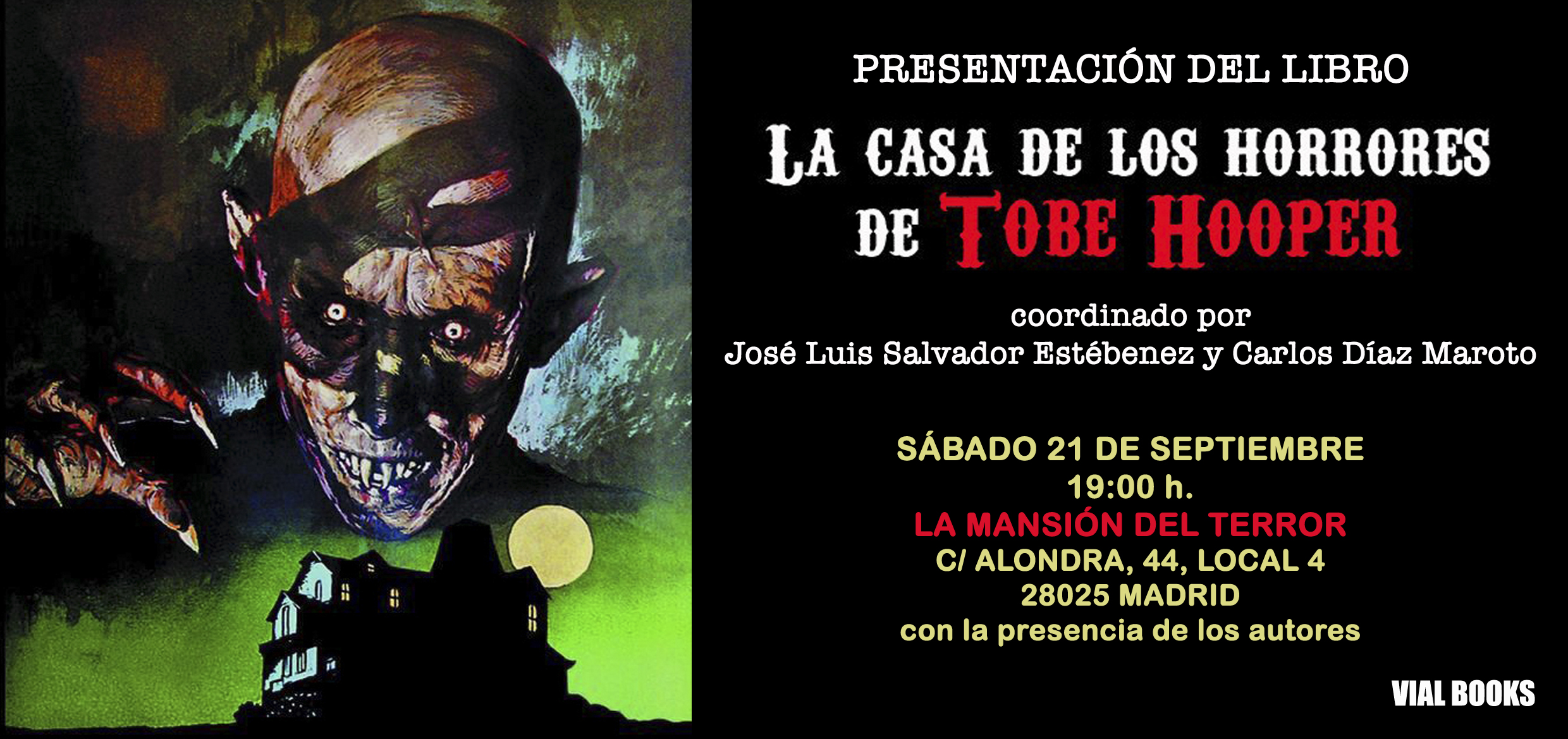 El próximo 21 de septiembre a partir de las 19 horas “La mansión del terror”, sita en la calle Alondra nº 44 (Metro Vista Alegre) de Madrid, y el sábado 5 de octubre en el espacio FNAC del Festival de Sitges, acogerán la presentación de La casa de los horrores de Tobe Hooper, en actos que contarán con la asistencia de varios de los autores de este libro monográfico coordinado por Carlos Díaz Maroto y José Luis Salvador Estébenez, quienes también estarán presentes.