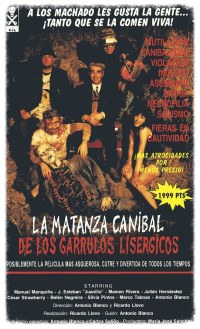 calle del medio metiendo canciones, escenas gore, amor y hasta un torpe tiranosaurio que camina como si llevara una cogorza. El resultado es tan divertido como sorprendente. La sesión vespertina en la Facultad de C.C. De la Información está dedicada a uno de los clásicos del cine trash patrio: La matanza caníbal de los garrulos lisérgicos (1993), filme de culto rodado en vídeo que homenajea a La matanza de Texas mezclando sin complejos gore y crítica social, con la situación del rural gallego como telón de fondo. Una obra loquísima dirigida por el malogrado Toñito Blanco y Ricardo Llovo, este último encargado de presentar la sesión en CutreCon junto a algunos de los miembros del reparto como la actriz Silvia Superstar (Killer Barbys) o el cantante César Strawberry (Def Con