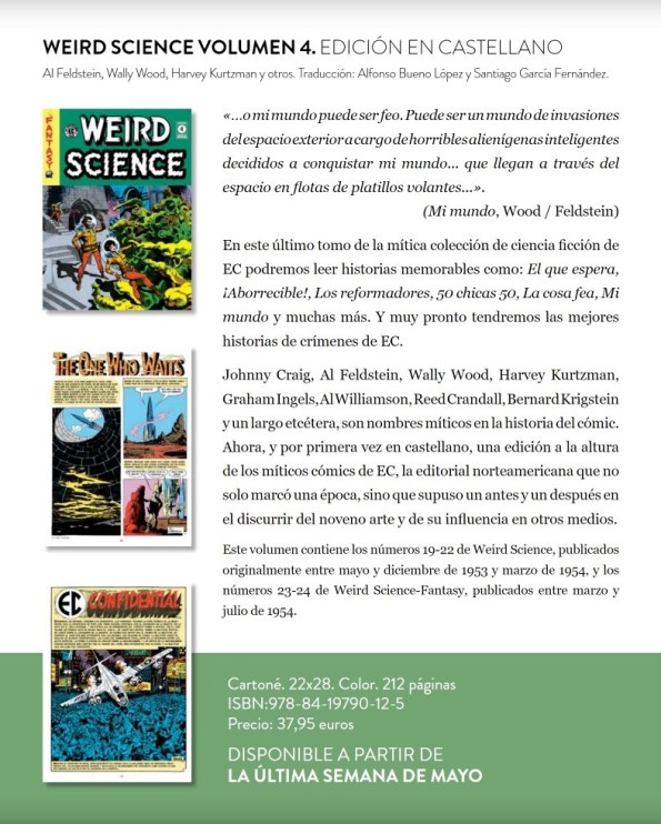 Se atisba el verano en el horizonte. Ya estamos otra vez… Pero antes de la playa y el calor; de los chiringuitos y la canción del verano, todavía hay tiempo para los espectros, la ciencia-ficción, Los Picapiedra, Los Supersónicos, Maguila el gorila, y Tim Burton. Y de entre todo ello, lo mejor: finalizan Weird Science y Tales from the Crypt, pero no teman, pues la mejor y más fiel adaptación de los cómics E.C. proseguirá su andadura con nuevas series, Weird Science-Fantasy y Haunt of Fear. En Yabba-Dabba-Doo! su autor, el especialista Adrián Encinas, repasa absolutamente todas las series de dibujos animados realizadas por Hanna-Barbera que nos hicieron compañía a la hora de merendar. Un exhaustivo trabajo sobre los creadores de Don Gato y la Hormiga Atómica, entre muchísimos otros realizado, repetimos, por todo un conocedor en la materia. Tim Burton vuelve a Diábolo y lo hace con un nuevo libro dedicado a su universo, Tim Burton. De Bitelchús a Miércoles, en el cual su autor, Juan Luis Sánchez, analiza los mundos de un realizador que, pese a quien pese, pues muchos son los que lo han abandonado y denostado, es historia del cine. Y de la mejor. Y finalmente dos reediciones:El Castillo Ambulante. Un corazón es una pesada cargade Álvaro López Martín y el didáctico ¿De dónde vengo?