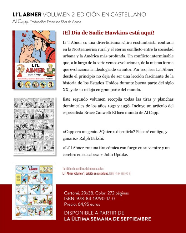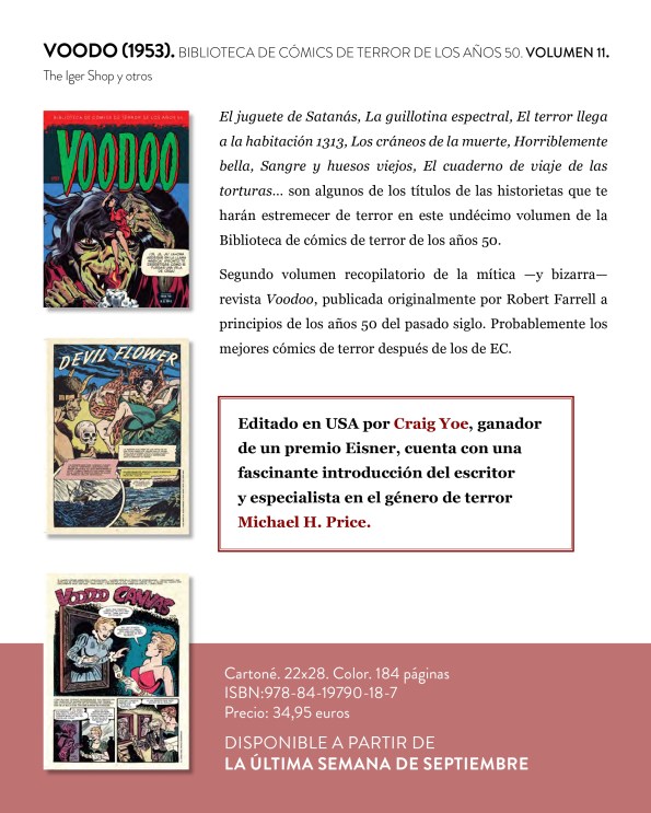 Se terminaron las vacaciones. El verano da sus últimos y torpes pasos y es hora de volver al trabajo, así que Diábolo lo hace anunciando nuevos y potentes lanzamientos para todos los gustos: cómic clásico con el undécimo tomo de la Biblioteca de Cómics de terror de los años 50 dedicado a la segunda entrega de Voodoo, la mítica cabecera realizada por Robert Farrell. Y también el segundo volumen dedicado a Li’l Abner de Al Capp. Clásicos editados en inmejorables condiciones. Pero Diábolo no sería Diábolo si no ofreciera libros dedicados al cine y la televisión y concretamente anuncia dos: uno ¡A jugaaar! La enciclopedia de los concursos de la tele, realizada por el especialista Miguel Herrero e Indiana Jones. La aventura tiene un nombre de Francisco Javier Millán, centrado en el aventurero del sombrero y el látigo. Entre las novedades también hay lugar para la novela con El lemnio y otras historias sobrenaturales de John Buchan, cuya obra, 39 Escalones, adaptó Hitchcock al cine durante su etapa inglesa. Y por si todo esto fuera poco, tres reediciones: el imprescindible Mi vecino Migazaki, ¡Luz, fuego, destrucción! el primer tomo dedicado al universo Dragon Ball y Los Goonies. Nunca dicen muerto, que analiza en profundidad esta cinta generacional de los ochenta.