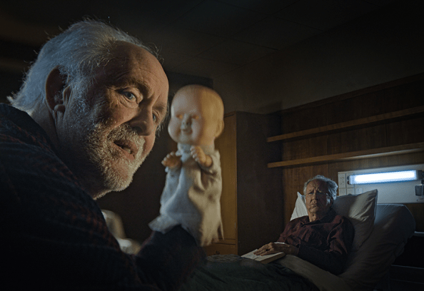 pero también por su director, pues quedó impactado por su anterior película, Atrapados en la oscuridad (Coming Home in the Dark (2021). Y, para nada quedó defraudado, pues el actor y director neozelandés James Ashcroft había preparado una película bien distinta a la que ofreció, también en Sitges, tres años antes. Ahora nos presenta a un severo juez (encarnado por el gran Geoffrey Rush) que sufre un ictus que hace que termine (temporalmente, como no se cansa de repetir) sus días en una residencia de ancianos. El cascarrabias juez mira todo y a todos por encima del hombro, pero encontrará la horma de su zapato en otro interno (John Lithgow), un sádico jubilado que disfrutará haciendo el mal y visitando por la noche a los otros internos con su terrorífica marioneta de mano. Es como si el terrible asesino en serie Trinity, auténtica némesis de Dexter en la serie del mismo nombre y también interpretado por Lithgow, se hubiera jubilado y estuviera interno en un geriátrico.