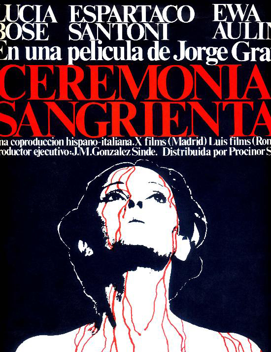 Juan Huarte era responsable de la productora y distribuidora X-Films, fundada a mediados de los 60, con interés por el cine de autor. Además de a Jordi Grau, produjo varios cortometrajes a unos jóvenes Angelino Fons, Claudio Guerín, Chumy Chúmez y José Luis Garci, entre muchos otros. Al asociarse con José María González Sinde, que haría de responsable estratégico y económico, X-Films se abrió a un cine más comercial. Y Ceremonia Sangrienta sería la primera apuesta de González Sinde en 1973.