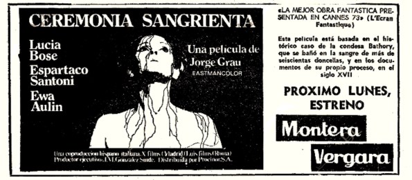 En la misma década que ambas autoras, se arrebataba Jordi Grau por la figura de Erzsébet Báthory. La idea de retratar su vida le llegó a Grau durante su estancia, en 1964, en el festival de Karlovy Vary (República checa), en el cual participó con su segundo largometraje, El espontáneo. Allí le hablaron por primera vez de la trágica historia de la condesa y visitó las ruinas del castillo en el que vivió, situado en Čachtice (Csejte), actual Trenčín (Eslovaquia), y en cuya habitación en la torre fue emparedada en vida tras su condena en el juicio celebrado en Bytča (actual Eslovaquia), por torturar y asesinar a 650 doncellas. La historia conmovió al director, que la describió como “la expresión patética del deseo de superar, no ya la muerte, sino el final de la juventud, la belleza, del atractivo vital que para muchas mujeres, es la razón -confesada o no- de la propia existencia”[4] . De esta fascinación llegaría Ceremonia Sangrienta (1973), que habría sido el primer acercamiento cinematográfico a la figura, si el azar y el desinterés de las productoras hispanas por el género de terror, no lo hubieran impedido.