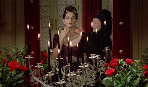 Porque el conflicto de Erzebet es su consternación por los estragos del tiempo sobre su piel y su belleza, ella es la que ocupa mayor metraje de reflectancia en la cinta. Enemigos a la par que aliados, los espejos son vitales en su día a día. La observamos en su mirarse y remirarse en su espejito de mano, como la madrastra de Blancanieves, atenta hasta el último detalle que pueda confirmarle que sigue siendo bella. En un momento decisivo de su evolución, la vemos contemplarse ensimismada en su fiel accesorio mientras su sirvienta la peina, en un descuido, esta última la pincha con una aguja de moño y ella reacciona violentamente asestándole un golpe con el objeto que guarda los secretos de su rostro, es tal la fuerza que imprime que hiere a la muchacha y la sangre de esa herida manchará sus vestidos y su mano: será la primera vez que descubra los efectos de la sangre virgen en su piel[12]. Pero Grau, sobre todo, nos muestra a la protagonista en grandes lunas en las que su reflejo da cuenta de su estado y su situación, en unos planos de riquísima y compleja composición. El director juega con su posición en el reflejo para significar su condición emocional y sus fuerzas, resulta magistral su uso del recurso para mostrar su caída en la depravación que supone, a la vez, su momento de mayor fuerza. El plano nos la ubica