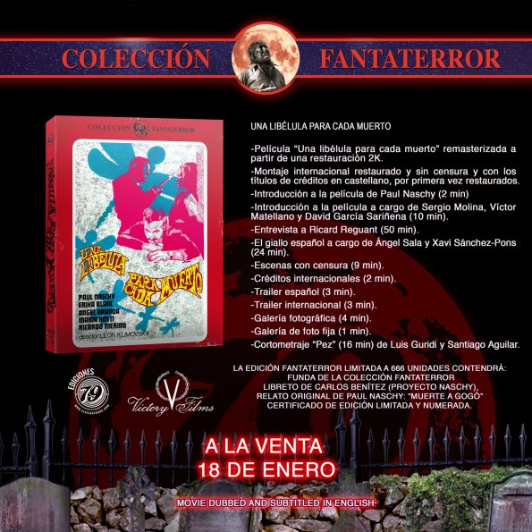 Entre los extras de Una libélula para cada muerto, Ángel Sala y Xavi Sánchez-Pons ofrecen una masterclass sobre el giallo español y Carlos Benítez charla con el gran Ricard Reguant, que recuerda su trabajo con Naschy y rememora su carrera en el cine ‘S’.