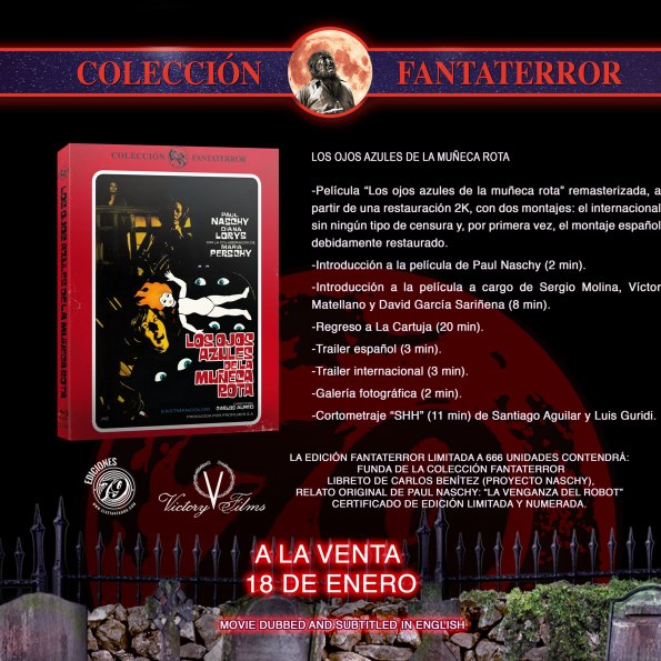 Estamos especialmente orgullosos del pequeño documental Regreso a La Cartuja de David Muñoz. En él se ha convertido un vídeo doméstico del propio Paul Naschy, durante una visita a la Cartuja de Talamanca del Jarama con unos amigos (entre los que se encuentran Antonio Mayans y Víctor Matellano), en una pieza documental sobre las localizaciones de algunas de sus películas más míticas como El Retorno del hombre lobo (también en la colección) o de la misma Los ojos azules de la muñeca rota. Demos las gracias una vez más a Sergio Molina por toda su ayuda. Regreso a La Cartuja está incluido tanto en la edición en DVD como en las ediciones en Blu-ray de Los ojos azules de la muñeca rota.
