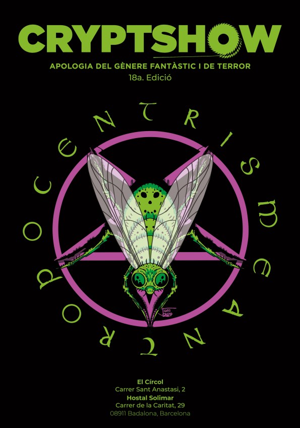En su decimoctava edición, Cryptshow Festival está dedicada al Antopocentrismo y el ilustrador del cartel, Toni Benages y Gallardo, nos invita a hacer una invocación satánica liderada por un ser tan insignificante, pero a la vez tan presente, como es una mosca. Cómo si del Hombre de Vitruvio es tratara.