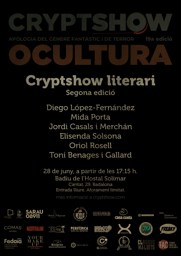 El festival tendrá lugar en Badalona, en dos fechas diferenciadas. El 28 de junio estará dedicado a la Literatura, con una jornada que mantendrá el formato estrenado el año pasado bajo el nombre Cryptshow Literario, al soportal del Hostal Solimar de Badalona.