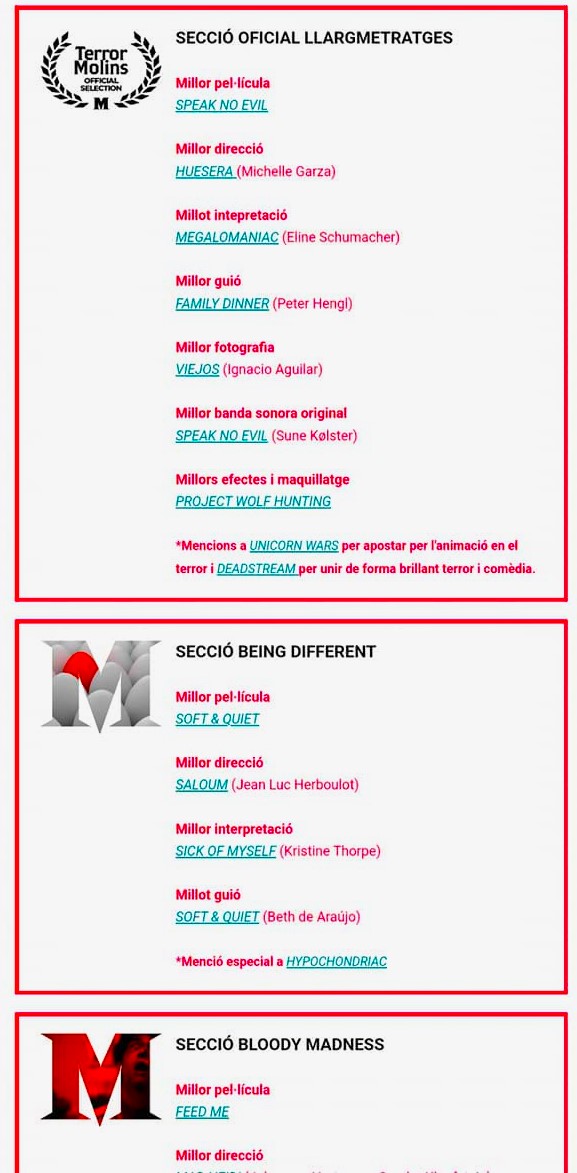 El Festival de Cine de Terror de Molins de Rei encara su última sesión, la Maratón de 12 horas, anunciando un palmarés predominado por los miedos en clave familiar y maternal. La danesa Speak No Evil, de Christian Tafdrup, sobre unas accidentadas vacaciones de dos familias centroeuropeas, gana los premios a mejor película y banda sonora, mientras que la mexicana Huesera, debut de Michelle Garza Cervera alrededor el embarazo, supersticiones y nuevas maternidades, gana el premio a la mejor dirección. El jurado compuesto por Claudia Guillén, Judith Colell, Felipe M. Guerra, Joan Vilà y Raquel Sastre ha premiado también el guion de Family Dinner, la fotografía de Viejos y la interpretación protagonista de Megalomaniac, además de los efectos especiales de Project Wolf Hunting. En las secciones paralelas destacan los premios a Soft & Quiet, ópera prima de la norteamericana Beth de Araújo sobre las consecuencias de los nuevos fascismos en los Estados Unidos, ganadora de mejor película y mejor guion de la sección Being Different. También obtiene dos reconocimientos la comedia negra sobre muerte asistida y antropofagia Feed Me, de Adam Leader y Richard Oakes, mejor película y mejor interpretación de la sección Bloody Madness. Completan el palmarés de Being Different la dirección del film senegalés Saloum, de Jean Luc Herboulot, y la interpretación protagonista de la satírica Sick of Myself, mientras que la controvertida Terrifier 2 gana el premio a los mejor efectos y Mad Heidi a la mejor dirección de Bloody Madness.En cortometrajes, el canadiense 11-33 obtiene el premio de la sección oficial, y El semblante y Kickstart My Heart ganan los premios al mejor guion e interpretación, respectivamente. Phelgm obtiene los premios a los mejores efectos y de la Crítica de Oro (Blogos de Oro), y O gana el premio Méliès d’Argent al mejor cortometraje europeo. En cuanto a la sección de cine catalán Ç Trencada, La masia, de Víctor Català, se alza como la gran vencedora: mejor film y premio del público.A lo largo de nueve días, el festival ha conseguido llenos absolutos en sesiones como la inauguración con Mad Heidi, las proyecciones de AveMaria, Terrifier 2, The Rocky Horror Picture Show, cortometrajes de Sección Oficial y Ç Trencada, y la Maratón de 12 horas que cierra el certamen. Con el festival todavía en marcha, las cifras de entradas vendidas ya superan en un 37% el récord del año anterior.