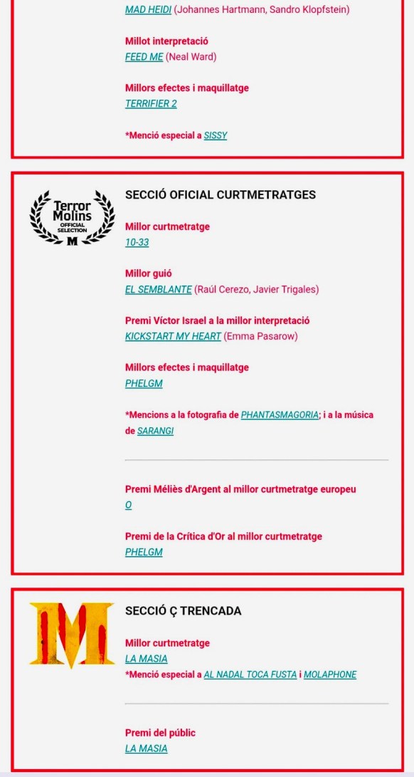 El 42º TerrorMolins levanta así el telón y se prepara para un primer fin de semana donde se homenajeará a la cineasta Mar Targarona, gran referente del cine de terror del país, y en el que los cortometrajes y el cine catalán serán los grandes protagonistas, con la gala de la sección Ç-Trencada y el encuentro del TAC – Terror Arreu de Catalunya, las proyecciones de los cortometrajes de Sección Oficial y de la sección TerrorKids.
