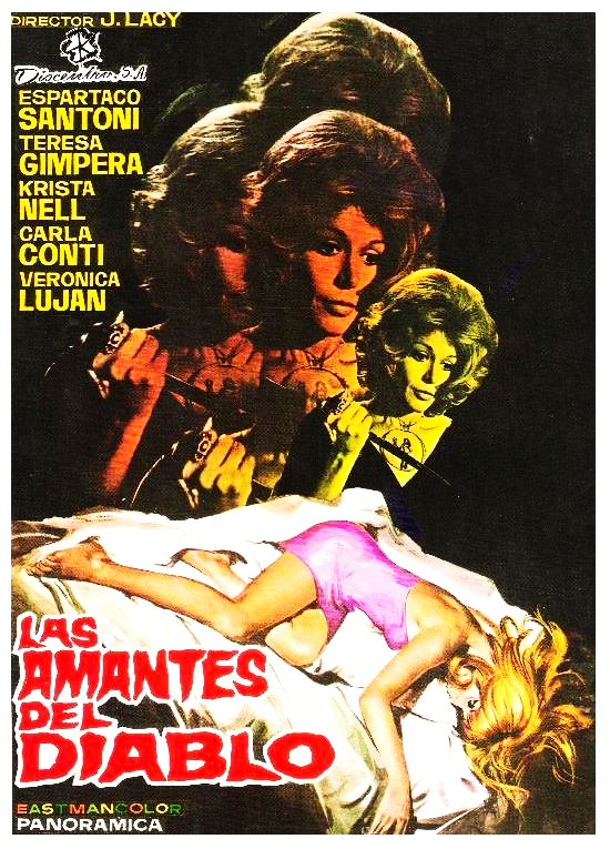 El guion, basado en una idea de Elorrieta y su protagonista, Espartaco Santoni, fue escrito por un habitual del director, José Luis Navarro, al que se sumó Marino Girolami (futuro director de Zombi Holocausto) y Miguel Madrid, que firmó como Michael Skaife, el mismo seudónimo con el que dirigió Necrophagus (1971) y la cinta de culto El asesino de muñecas (1975). Las amantes del diablo narra las andanzas del satánico Dr. Tills Nescu (Santoni), un playboy a imagen y semejanza del propio actor que incluso vive en un castillo situado en un lugar sospechosamente similar a Marbella. Al parecer practica magia negra y posee unos poderes hipnóticos con los que conquista a todas las mujeres jóvenes de la zona, incluida la protagonista, Hilda (Krista Nell) que investiga la extraña desaparición de su hermana María (Verónica Luján). Andrea, la secretaría de Nescu, interpretada por una fascinante Teresa Gimpera, también parece haberse prendado de Hilda, así que termina salvándola antes de matar al propio Nescu, que conserva en un ala del castillo los cadáveres de todas las chicas que ha secuestrado. Se descubrirá que el odio que profesa a las mujeres tiene su origen en un trauma infantil causado por su malvada madre. O algo así.