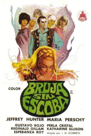 De prolongada carrera cinematográfica, el actor norteamericano Jeffrey Hunter había desembarcado en España por primera vez para interpretar nada menos que a Jesucristo en Rey de Reyes (King of Kings, Nicholas Ray, 1961), una de las películas rodadas en España por el imperio Bronston. A partir de ahí compaginó su carrera entre televisión y cine en su país y las ofertas llegadas de Italia y España, como es el caso de Una bruja sin escoba, una comedia en la que compartió protagonismo con una arrebatadora Maria Perschy. El film narra las peripecias de un profesor irlandés (Hunter) del que se encapricha una bruja (Maria Perschy) a la que él solo puede ver y que gracias a una joya mágica puede hacer viajes en el tiempo. De esa forma ambos visitarán la época medieval, la prehistoria, el imperio romano y el futuro, concretamente al año 1999 en una Tierra en la que tan solo quedan siete bellas supervivientes, debiendo ponerse manos (y otras cosas) a la obra para repoblarla. Pero la bruja truncará la situación retornándolo a la época actual. El resultado es un disparate, a veces hasta el sonrojo, pero ante todo curioso por ser posiblemente la única o una de las únicas películas españolas que han tratado el viaje en el tiempo y también por contar con algunos actores muy jóvenes y reconocibles para el aficionado, como Frank Braña, Perla Cristal, Esperanza Roy (acreditada como Esperanza Roig), el uruguayo Gustavo Rojo y el futuro director de cine Julio Pérez Tabernero, que aquí realiza un pequeño papel.