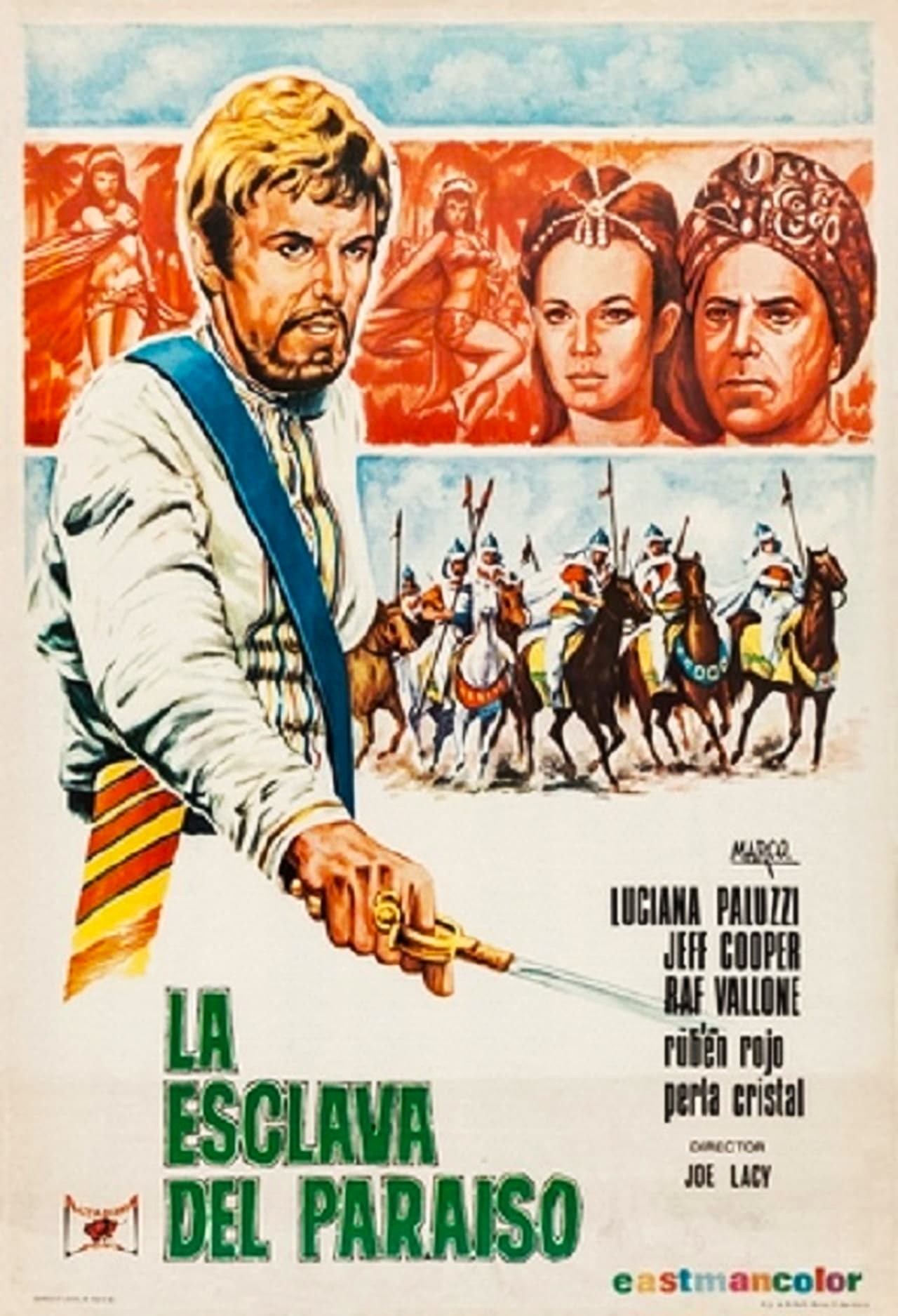 De nuevo en coproducción con Italia (De Laurentis), Elorrieta se embarca en La esclava del paraíso (1968), una fantasía oriental a lo mil y una noches ambientada en una Granada bajo dominio árabe. Naturalmente la ciudad ofrece al director escenarios de categoría, llegando a rodar en la misma Alhambra, pero también en otras localizaciones de Córdoba, Almería y Sevilla. El papel de héroe lo encarna Jeff Cooper, un actor norteamericano con una carrera no demasiado ilustre en televisión que decidió probar fortuna en España, rodando para Elorrieta, y a continuación en Alemania antes de marchar a México, donde encarnó al exótico héroe de la radio y el cómic Kalimán, el hombre increíble, volviendo después a Estados Unidos. Tras interpretar al protagonista de El círculo de hierro (Circle of Iron, 1978), monumental desastre basado en un argumento del difunto Bruce Lee, retornó al mundo de la televisión. Como acompañante y soporte cómico del héroe, Elorrieta contó con Rubén Rojo, hermano del también actor Gustavo Rojo, un perfecto todoterreno nacido en Madrid pero que desarrolló su carrera en México.