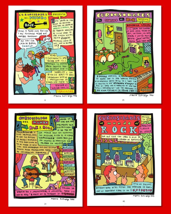 Mauro Entrialgo es muchas cosas: un lúcido analista de la actualidad vista desde el sentido común, actividad que desarrolla como activista en la web, además de como dibujante y escritor; un coleccionista de dispensadores PEZ; ilustrador y dibujante de humor con retranca. Lleva muchos años en activo. Combatiendo desde fanzines a revistas de tendencias. Pero también es/fue músico en un grupo, lo cual le permite cierta autoridad a la hora de comentar estas Curiosidades del mundo del Rock en una tira que publicó a partir de 1996 difuminada en diversas publicaciones que editorial Ponent recopiló en un libro lárgamente agotado y que ahora Diábolo Ediciones pone nuevamente en circulación en un manejable formato.