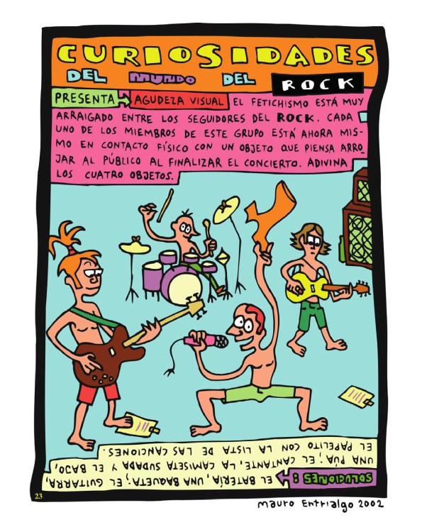 Curiosidades del mundo del Rock está realizado en forma de pasatiempo gráfico -no desesperen, las soluciones están en la misma página- respondiendo a cuestiones como ¿quien es esa chica que baila de manera tran entregada en primera fila en el concierto de unos novatos? ¿Que diferencia una camiseta de rock de una perteneciente a cualquier otro ramo? O ¿cómo distinguir al que se ha colado en la presentación de un disco? Todo rigurosamente cierto. Todo científicamente comprobado. Todo, todo, muy divertido.