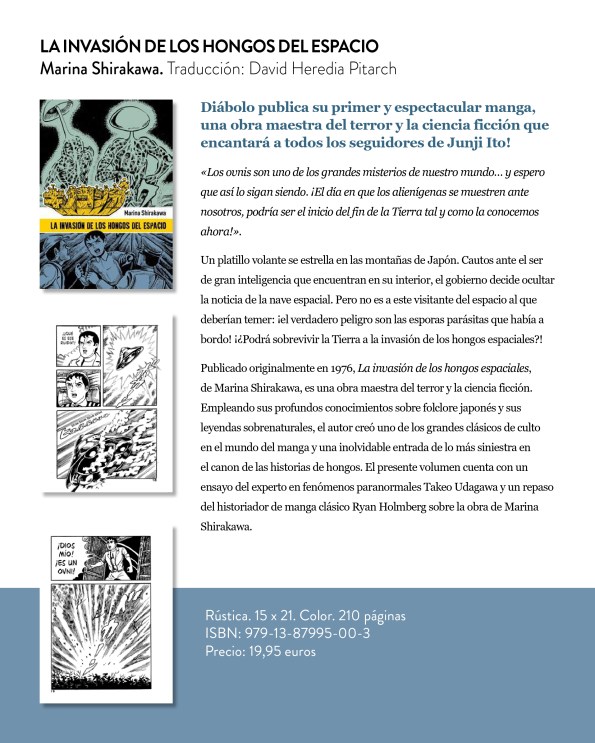 Nuevamente llegan las novedades de Diábolo Ediciones cargadas de buen cómic, literatura y cine, con la ciencia-ficción como telón de fondo. Cómic con el primer manga editado por Diábolo, ‘La invasión de los hongos del espacio’ de Marina Shirakawa un clásico inédito en nuestro país publicado en Japón en 1976. También la tercera edición de ‘La expedición. El león de Nubia’, una serie que está a punto de finalizar y cuyo primer tomo se encontraba totalmente agotado. Y ‘Luna de miel. El beso de la esfinge’ perteneciente a la nueva serie en tres tomos de Bastien Vivès. Anime tendremos con la nueva edición ampliada ¡la décima ya! del mejor libro dedicado a la obra del que ya es un japonés universal: ‘Mi vecino Miyazaki’. Por su parte ‘She-Ra’. Ella tiene el poder’ analiza el paso de este personaje por todo un universo multimedia: cómic, series animadas, merchandising… En ‘No identificado’, tendremos nuestra ración de cine con un trabajo que analiza casos reales de apariciones de ovnis con adaptaciones de los mismos a las pantallas. Y dejamos lo que nos parece mejor para el final, pues ya saben que en esta casa somos muy de monstruos: ‘Colecciones monstruosas’ enumera y mezcla amenamente todas las colecciones de cromos y otras delicatessens editadas en nuestro país en el pasado. Toda una bomba pop con un regusto nostálgico para los lectores de Diábolo Ediciones.