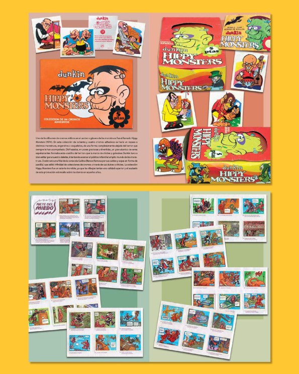 Vicente Pizarro ya nos ha hablado de la afición a los cromos y coleccionables que tuvimos los niños de los setenta y los ochenta en algunos deliciosos libros, también publicados por Diábolo, como ¡Andá!, la merienda…Las deliciosas colecciones de nuestra niñez, ¡Andá!, la merienda…Más Deliciosas colecciones de nuestra niñez y ¿Quieres un chicle? Regalos y sorpresas con sabor extralargo de los que ya hemos hablado aquí, y ahora se atreve con un libro monográfico sobre las colecciones dedicadas a los monstruos y al terror. Y, desde luego, hay más de las que, personalmente, pensábamos. Desde Frankenstein y el hombre lobo, una rara avis de 1946 publicado por Fher, hasta La Pandilla Basura a finales de los ochenta, pasando por Hippy Monsters y su reencarnación en los ochenta, Punky Monsters, sin olvidar colecciones de películas y series e incluso los gore cromos de La mansión del Terror y Efectos Especiales. Y no solo cromos, también figuras de pastelitos y otros artículos.