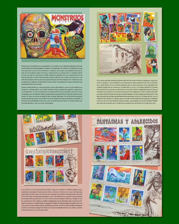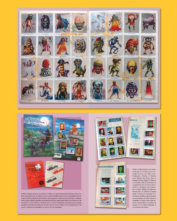 En España hubo que esperar a los años setenta para que cómics como Dossier Negro, Vampus, Rufus y Vampirella, que adaptaban las publicaciones Warren, llegaran a nuestras manos. Pero llegaron y seguidos de una pléyade de imitaciones que colmaron nuestros kioscos. Había, por tanto, interés en los cómics de terror. Y siempre hubo afición por el cine de terror. Los monstruos de la Toho llegaban a nuestras pantallas y los niños no tenían problema para entrar en los cines de sesión doble y ver esas películas, junto a otras como la saga de El planeta de los simios y los vestigios de la Hammer, además del cine de terror español, con lúgubres templarios esqueléticos y hombres lobo a la cabeza. Sí los monstruos gustaban a los niños y las primeras colecciones de cromos llegaron a las librerías y kioscos.