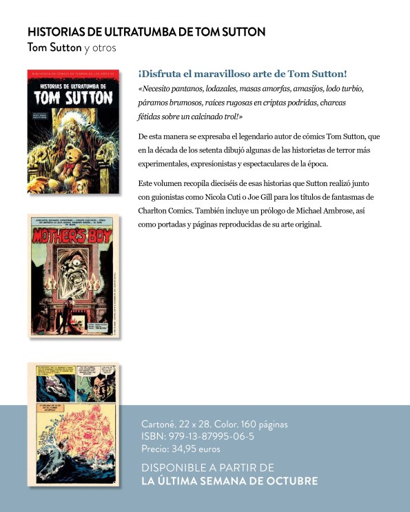 Las novedades de Diábolo para octubre de 2025 vienen con el sabor de la leyenda, del papel añejo, de las viejas novelas editadas en pulpa de papel. Como es el caso de los cómics antiguos, pero inmejorables, que nos trae un nuevo tomo de la Biblioteca de Cómics de Terror de los años 50, en esta ocasión dedicado a las ‘Historias de Ultratumba de Tom Sutton‘. También dentro del mundo del cómic, en esta ocasión realizado por jóvenes talentos, tenemos un número más, el 32, de la revista Cthulhu. También un trío de libros dedicados a la fantasía con ‘Conan el Bárbaro. Su travesía por la literatura‘; ‘Flash Gordon, historia de un héroe galáctico‘ y ‘Los mil rostros del Fantasma de la Ópera‘. Y como no podía faltar el anime, tenemos en este caso una tercera edición de ‘En busca de Totoro’ ¿Hace falta más?