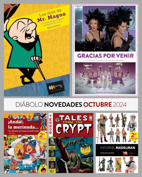 Mucha cultura popular, dibujos animados y cómic en esta nueva tanda de novedades de Diábolo Ediciones. Cómic con la ¡tercera edición! del primer tomo de Tales from the Crypt; Dibujos animados con Los ojos de Mr. Magoo. Los visionarios dibujos animados de la UPA, un libro realizado por el especialista Adrián Encinas; y finalmente mucha cultura popular con juguetes (la reedición del primer tomo de Informe Madelman), Cromos (la segunda edición de ¡Andá!, la merienda… y espectáculo popular con Gracias por venir. La revista musical en el cine y la televisión. Ahí es nada. Y que los fanáticos del cómic no se alarmen, pronto habrá buenas noticias para ellos.