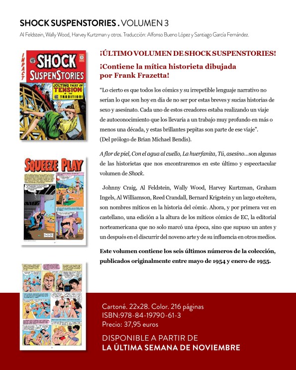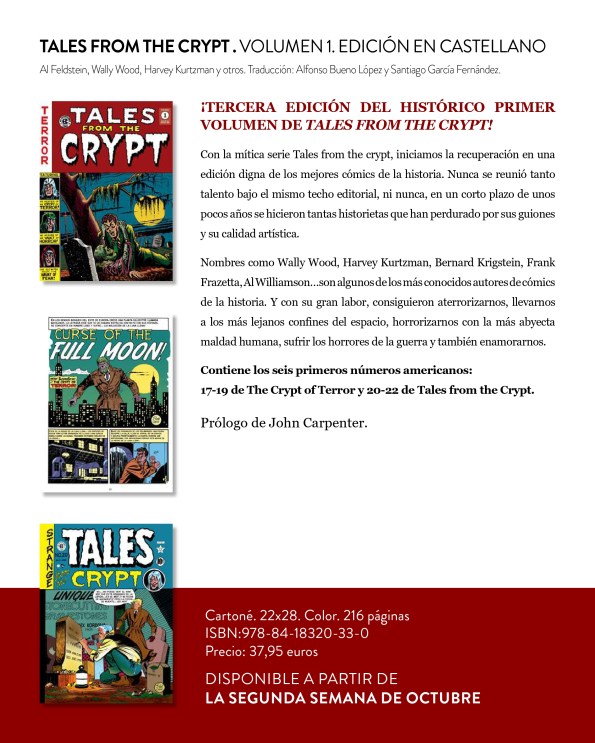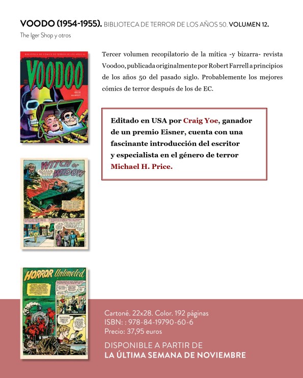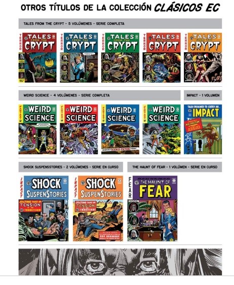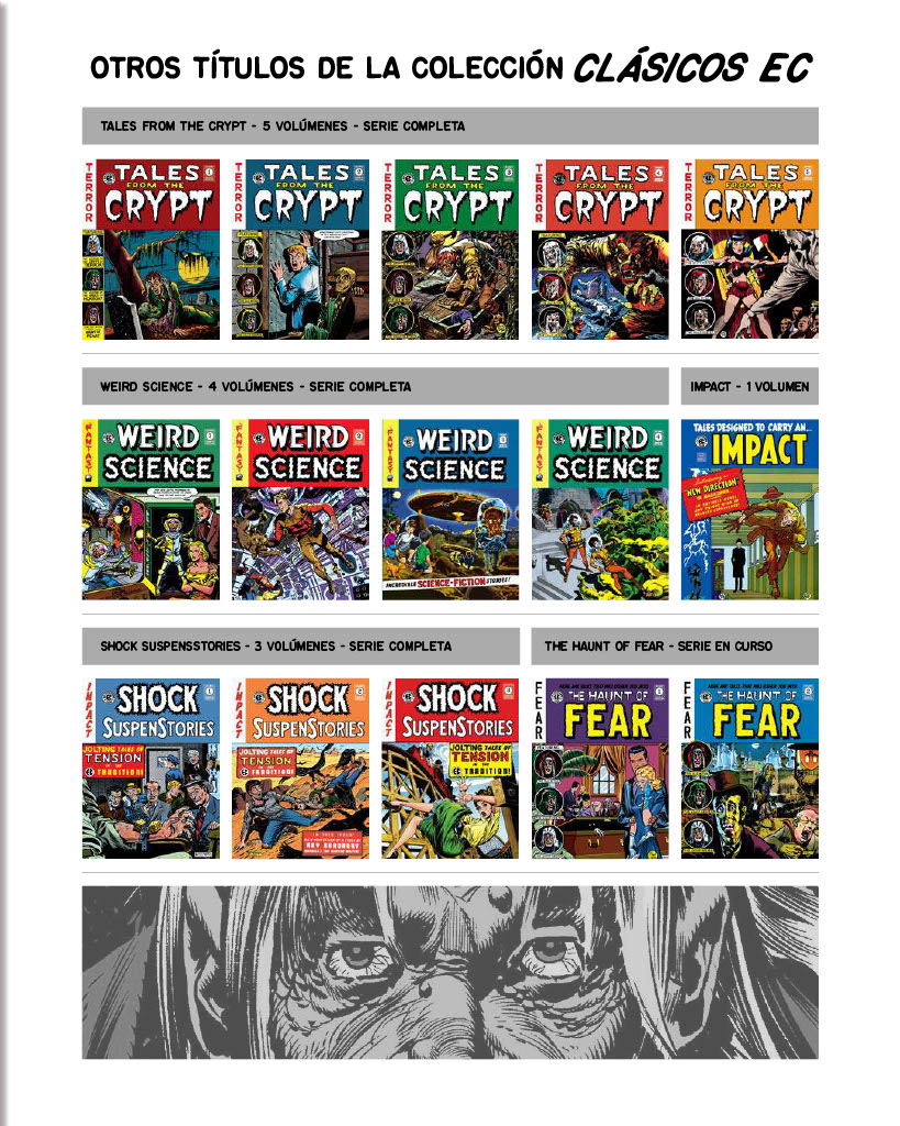 mala faena! (Bum Steer!) la historieta de Jack Davis que cierra en número y que contará con una folklórica venganza ultraterrena. ¡Oooole! Pero antes llega Graham Ingels y el hedor de la tierra del cementerio con ¡Un negocio de mala muerte! (Grave Business!) en la que un propietario de empresa funeraria pagará duro por todas las estafas y trucos que utiliza para engañar a sus afligidos clientes. Johnny Craig dibuja y escribe ¡La vampiresa! (The Vamp!) en la que el protagonista deberá escoger entre dos mujeres muy diferentes entre ellas… o no tanto. Acabamos con Jack Kamen y ¡Mi tío Ekar! (My Uncle Ekar) una historia protagonizada por un niño de lo más raro.