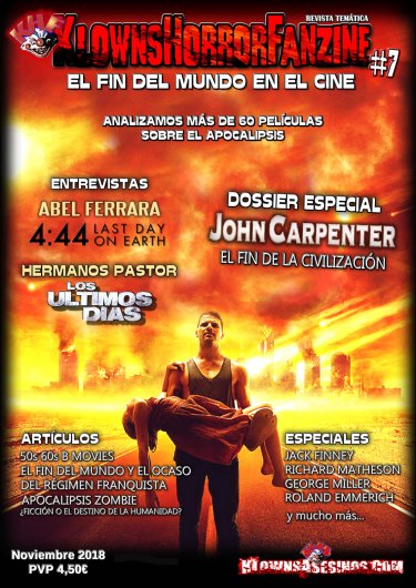A partir del 1 de noviembre estará a la venta el KLOWNS HORROR FANZINE #7, revista temática publicada por KlownsAsesinos.com, que en ésta ocasión centra sus páginas en El Fin del Mundo en el Cine. Un monográfico dedicado a ese cine pesimista, desolador y catastrofista que de muy diversas maneras ha tratado el tema ya, desde años muy tempranos.