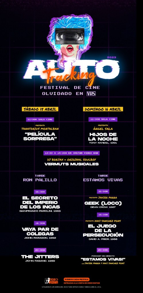 Durante el fin de semana del 15 y 16 de abril de 2023, la sala de cine de Video Instan acogerá una serie de proyecciones en (glorioso) VHS donde podremos ver algunas películas que a día de hoy siguen inéditas en otro formato por una razón u otra en nuestro país, pero siguen en alquiler en el extenso archivo de Video Instan.AUTOTRACKING es una carta de «amor fou» al formato analógico del video VHS, sobre todo a todas aquellas películas de explotación, esperpénticas y psicotronicas que se colaban entre el cine más comercial y nos atraían con el arte de sus carátulas y sus promesas imposibles.Algunas de las sesiones del festival serán presentadas por invitados de lujo como Ángel Sala (director del festival de Sitges), Xavi Sanchez Pons y Javier Parra (críticos de cine y creadores del podcast «Estamos Vivas» o Tanatorius Mortalban, youtuber sobre cine en VHS.