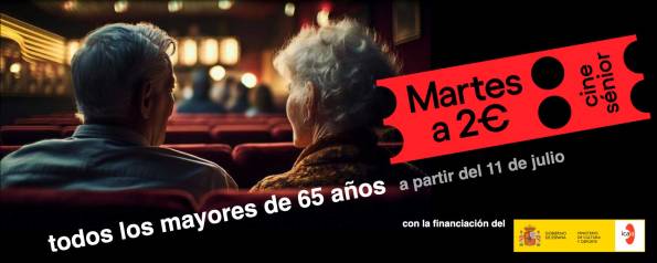 A partir de hoy, gracias a la campaña “Cine Sénior” las personas mayores de 65 años podrán disfrutar todos los martes del cine en pantalla grande a un precio especial de 2€ por entrada, en más de 3.000 pantallas distribuidas a lo largo de todo el territorio. El listado completo de salas participantes se puede consultar en el siguiente enlace:
